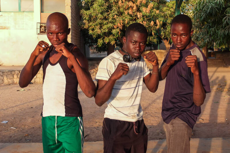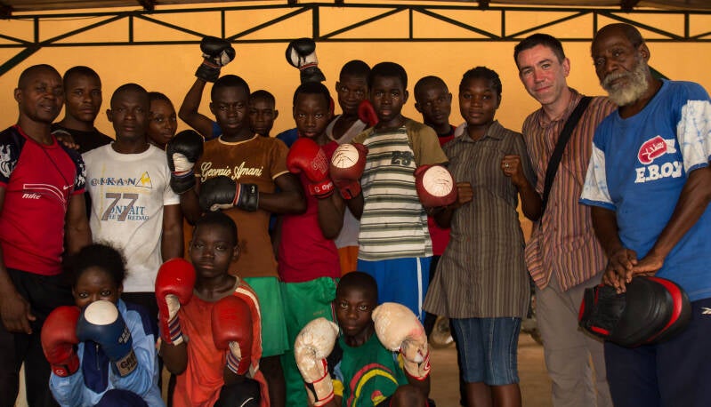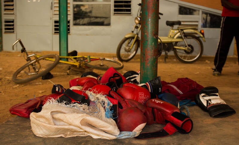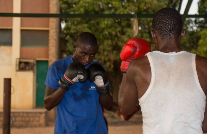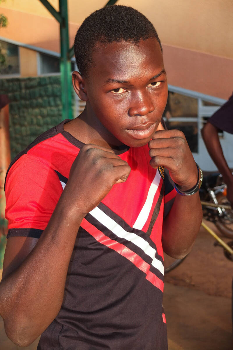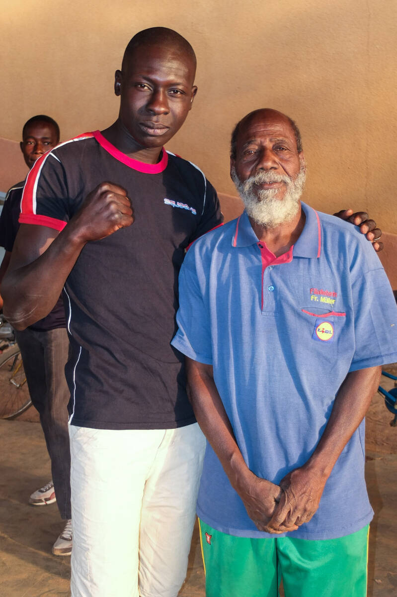 équipe nationale de boxe, à l'entraînement et son coach, Yassia Ouedraogo, dit "boum boum"