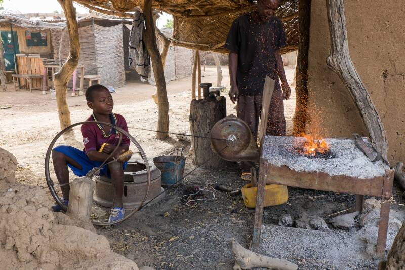 Tampaogo est un petit village mossi, à 80kms au nord de Ouagadougou. A cet endroit réside la famille Sawadogo. Il s'agit d'une famille de forgerons et, même si la forge occupe une place centrale, tous les métiers sont pratiqués afin d'assurer un minimum d'autonomie (culture du mil, meunier, couturier...).