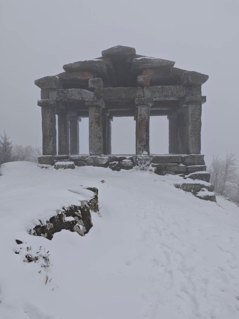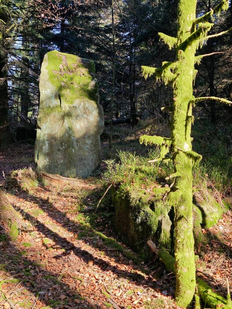 Borne armoriée du prieuré de Saint-Quirin Pierre du Sabbat Pierre "milliarium" qui bornait les voies romaines menhir couché